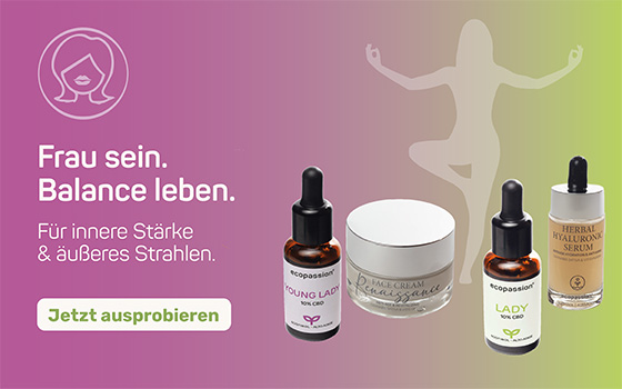 ecopassion® YOUNG LADY ist ein vitales Öl aus BIO-zertifiziertem Hanfsamenöl aus Südtirol, angereichert mit 10 % CBD-Isolat pflanzlichen Ursprungs sowie Heilpflanzenextrakten von wilder Yamswurzel, Frauenmantel und Schafgarbe aus den Dolomiten – mit einer ausgeprägten beruhigenden, schützenden und antioxidativen Wirkung.