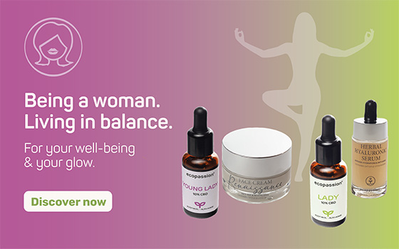 ecopassion® YOUNG LADY is a vital oil made from BIO-certified hemp seed oil from South Tyrol, enriched with 10% plant-based CBD isolate and herbal extracts of Dioscorea villosa, Alchemilla and yarrow sourced from the Dolomites, known for their soothing, protective and antioxidant properties.