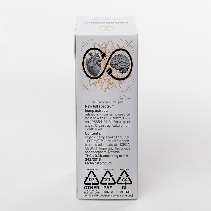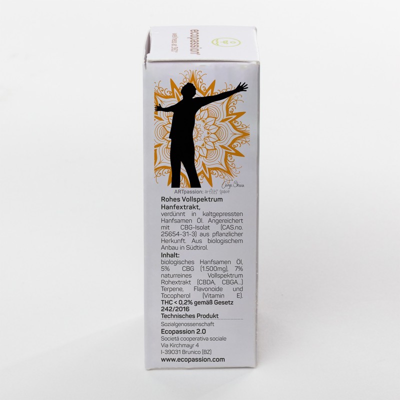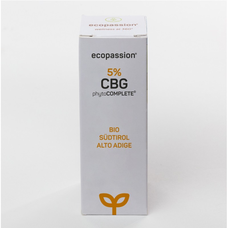 ecopassion® CBGphytoCOMPLETE© 5% is a natural, single-variety full-spectrum raw hemp extract in its natural, non-decarboxylated form, enhanced with plant-based CBG isolate and diluted in certified organic hemp seed oil.