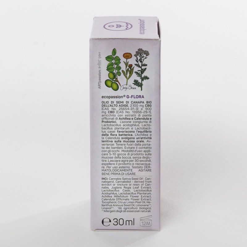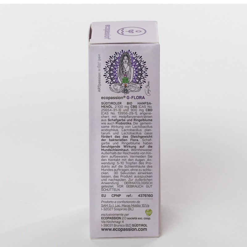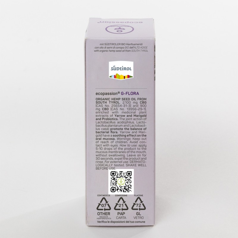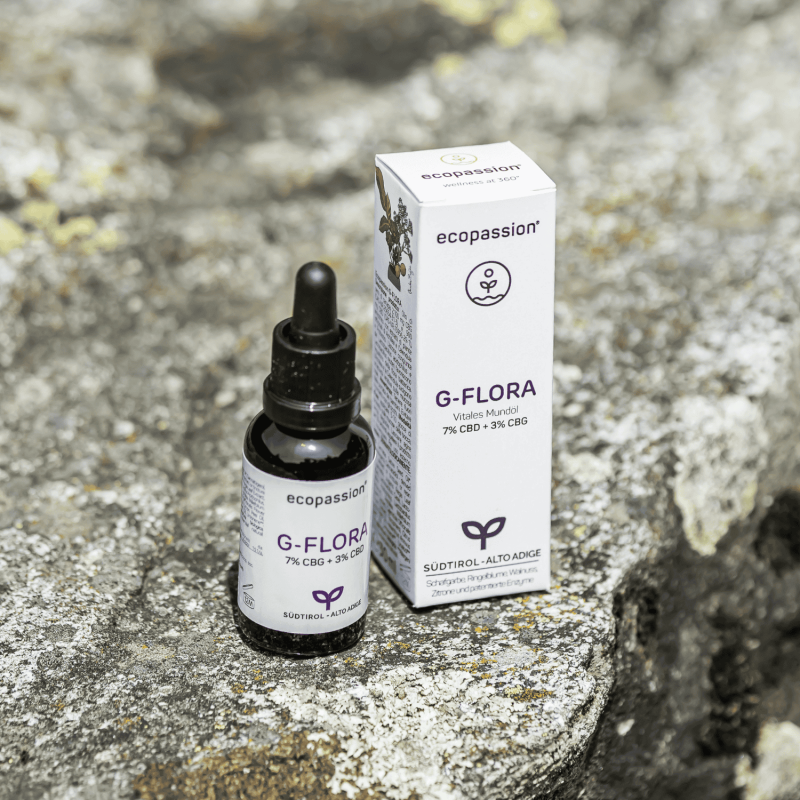 ecopassion® G-FLORA is a vital oil made from BIO-certified hemp seed oil from South Tyrol, enriched with 7% plant-based CBG isolate and 5% plant-based CBD isolate, probiotics and herbal extracts of yarrow and marigold, with a regulating and protective effect to support the gut microbiota and the natural barrier function.