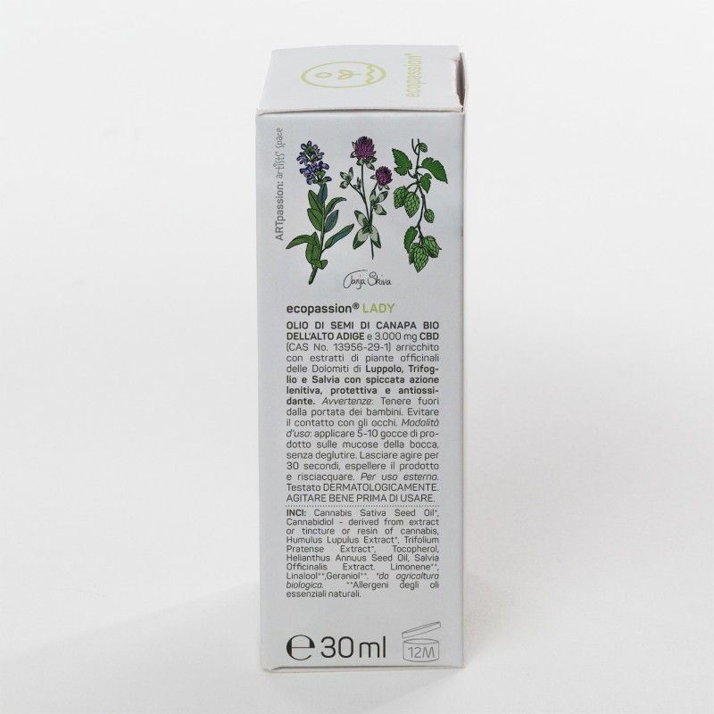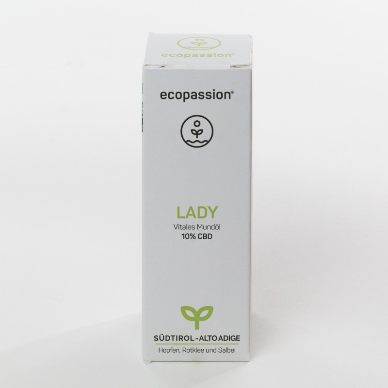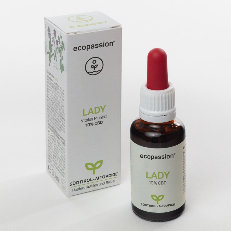 ecopassion® LADY is a vital oil made from BIO-certified hemp seed oil from South Tyrol, enriched with 10% plant-based CBD isolate and herbal extracts of hops, red clover and sage sourced from the Dolomites, known for their soothing, protective and antioxidant properties.