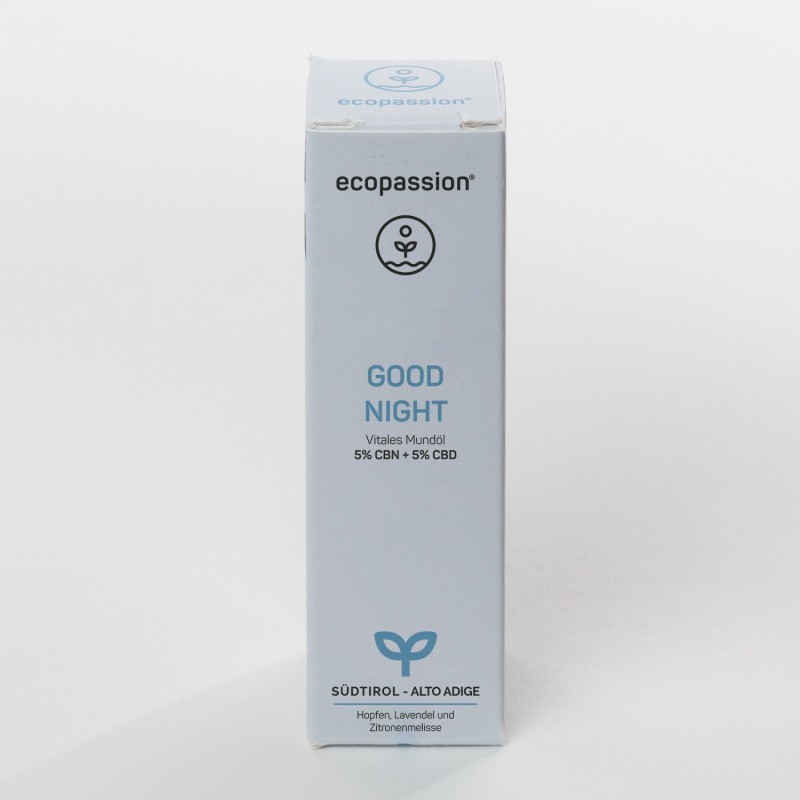 ecopassion® GOOD NIGHT è un olio vitale a base di olio di semi di canapa dell'Alto Adige certificato BIO, arricchito con il 5% di isolato di CBN e il 5% di isolato di CBD di origine vegetale, ed estratti di piante officinali di luppolo, melissa e lavanda delle Dolomiti, con effetto rilassante e favorente il sonno notturno.