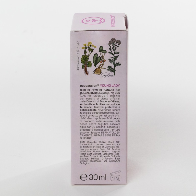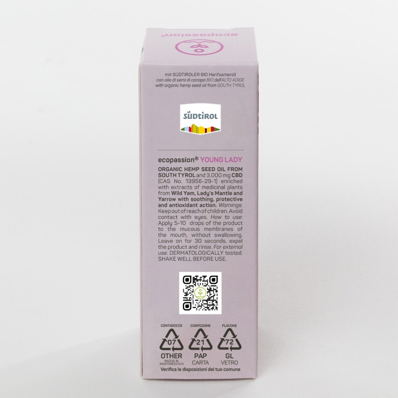 ecopassion® CBD YOUNG LADY è un olio vitale a base di olio di semi di canapa dell'Alto Adige certificato BIO, arricchito con il 10% di isolato di CBD di origine vegetale, ed estratti di piante officinali di Dioscorea villosa, Alchemilla e achillea delle Dolomiti, dalle spiccate proprietà lenitive, protettive e antiossidanti.