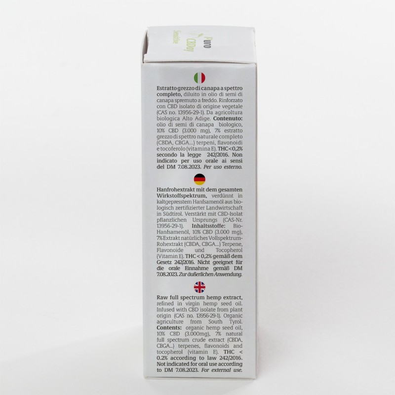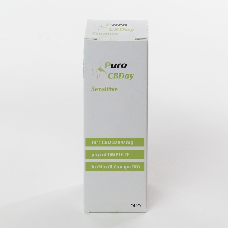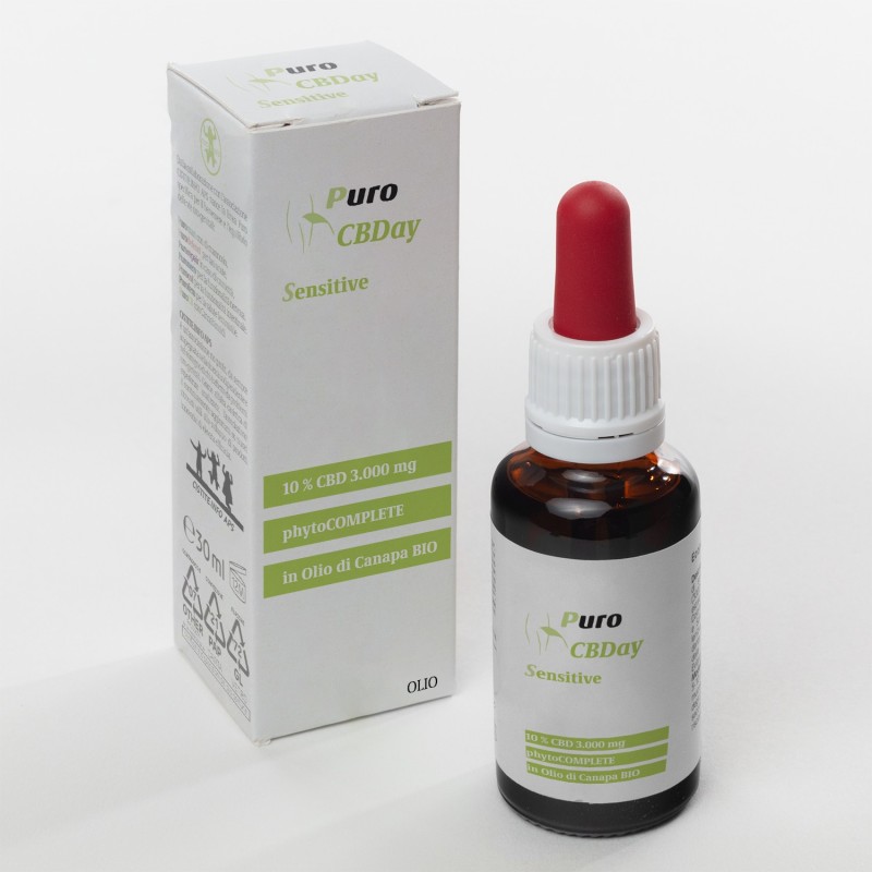 Puro® CBDay Sensitive è un estratto grezzo monovarietale a spettro pieno di canapa naturale, in forma amminoacida, rinforzato con isolato di CBD di origine vegetale e diluito in olio di semi di canapa certificato BIO.